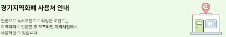 포인트는 매월 25일 지역화폐로 자동 전환되며, 전환된 지역화폐는 경기도 내 351개 인증 지역서점에서 책을 구매하는 데 사용할 수 있습니다.