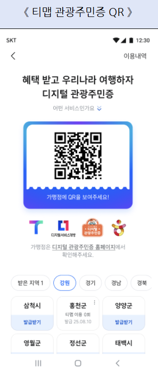앱 설치 후 회원가입 → 디지털 관광주민증 메뉴 선택 → 여행할 지역 1곳 선택 → 자동 발급 → 생성된 QR코드로 현장 할인 적용