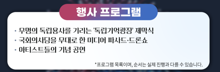 대한이 살았다! 라는 주제로 진행되는 이번 행사는 독립기억광장 제막식부터 미디어 파사드, 드론 쇼, 불꽃, 그리고 강산에·폴킴·싸이까지 화려한 K-POP 무대가 기다립니다.