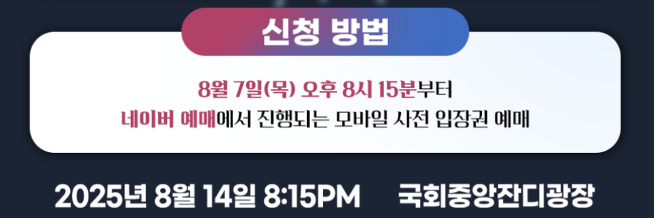 행사는 2025년 8월 14일(목) 오후 8시 15분 국회 중앙잔디광장에서 열립니다.