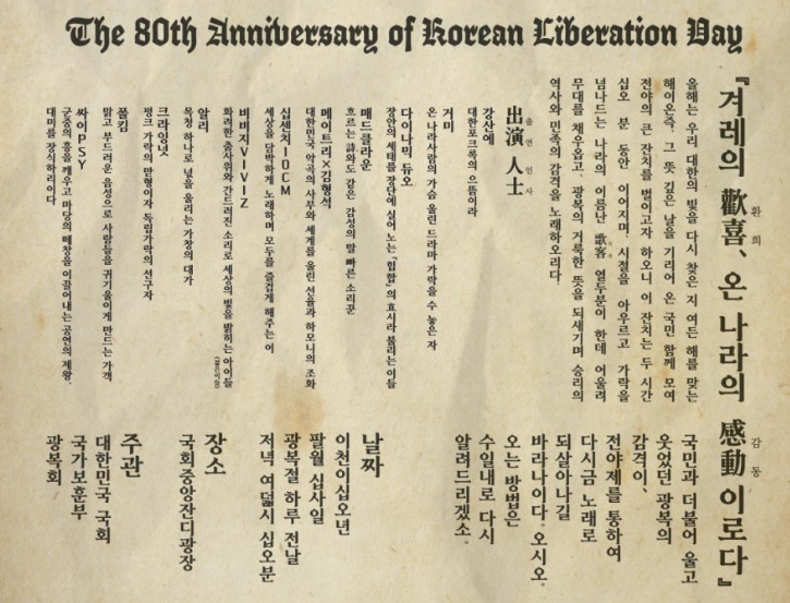 “올여름, 단 하루! 광복 80년 전야제가 국회 앞에서 펼쳐집니다.”