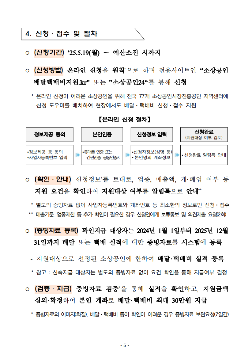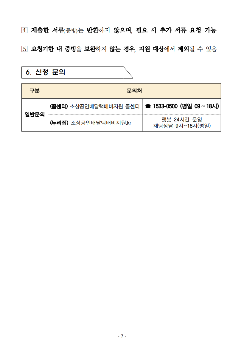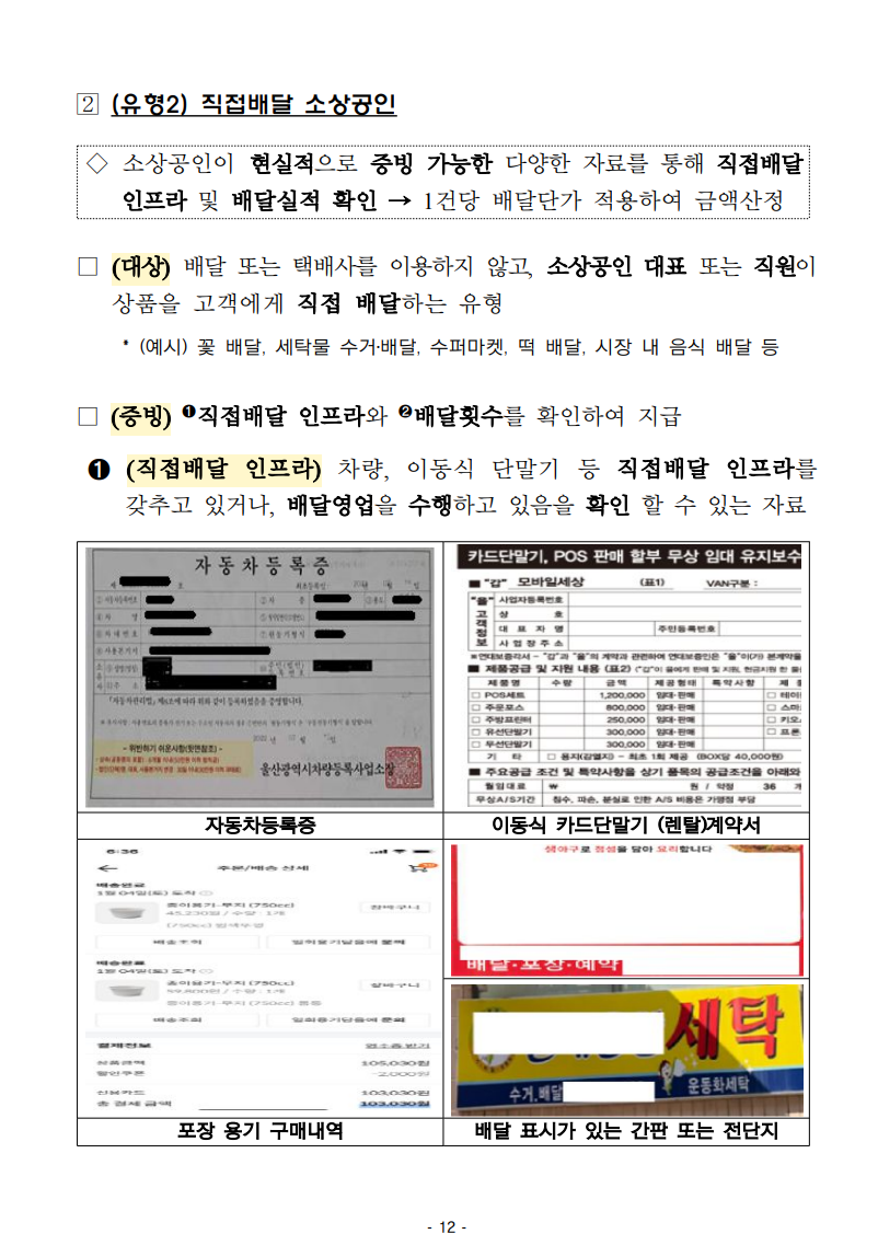 · 인프라 증빙: 차량·오토바이 등록증 또는 렌트계약서, 이동식 카드단말기 영수증 또는 계약서, 포장용기 구매내역, 배달이 명시된 전단지 또는 간판 등