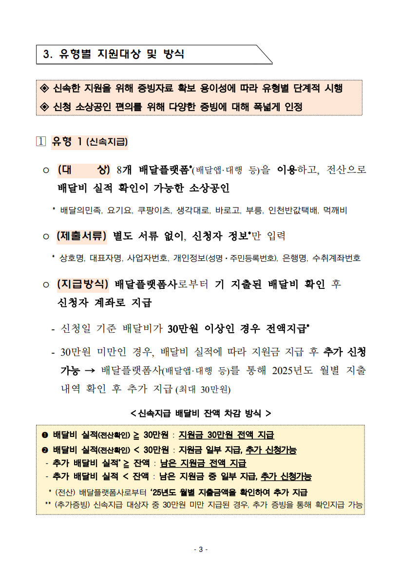 · 배달비 지출이 30만 원 미만이면 해당 금액만 지급하고, 이후 추가 실적 발생 시 재신청 가능