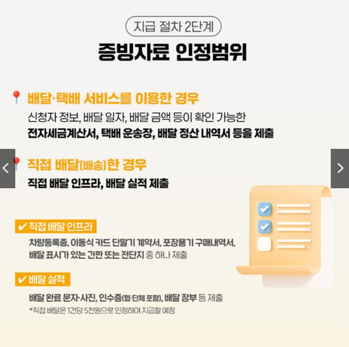 직접배달의 경우 차량등록증, 이동식 카드단말기 계약서, 포장용기 구매내역 등 인프라 증빙과 함께 배달 완료 문자·사진, 인수증, 배달장부 등 실적 증빙을 모두 제출해야 하며, 1건당 5천 원으로 인정되어 총 60건을 제출하면 최대 금액을 받을 수 있습니다.