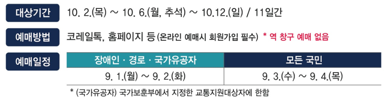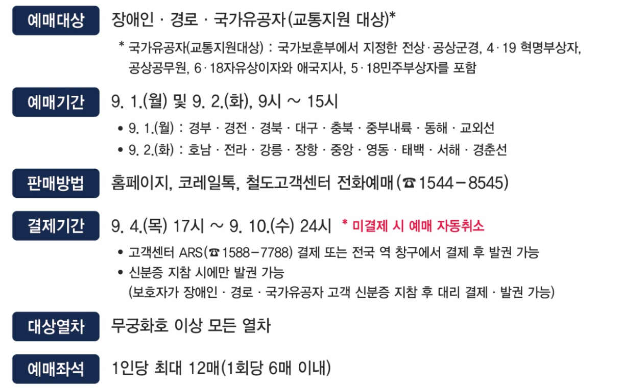 | 사전 예매 (교통약자) | 9월 1일 | 09:00~15:00 | 경부·경전·경북·대구·충북·중부내륙·동해·교외선 | 고령자·장애인·유공자 |
