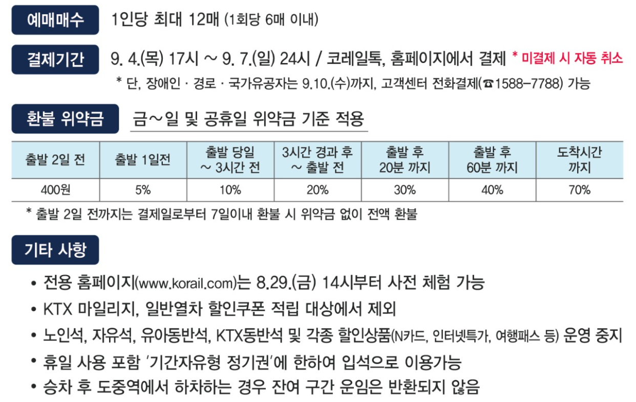 | 사전 예매 (교통약자) | 9월 2일 | 09:00~15:00 | 호남·전라·강릉·장항·중앙·영동·태백·서해·경춘선 | 고령자·장애인·유공자 |