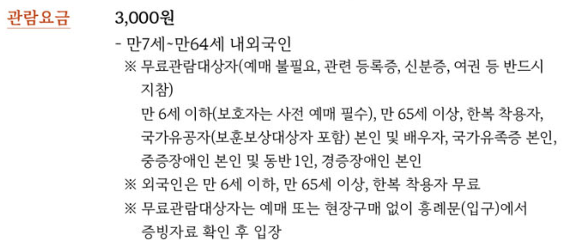 일반 유료 예매와 달리 무료관람 혜택을 받을 수 있는 경우도 있습니다. 무료관람자는 온라인 예매가 필요 없으며 흥례문 출입구에서 신분증 또는 증빙서류를 제시하면 바로 입장이 가능합니다.