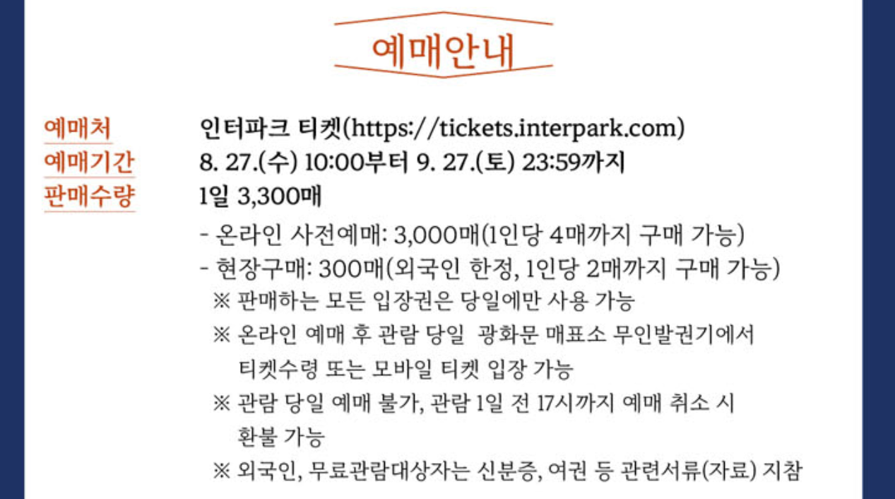 A. 예매 취소 기한은 관람일 하루 전 오후 5시까지입니다. 따라서 이 시간 직후에는 취소표가 풀릴 가능성이 큽니다. 또한, 현장 판매용으로 외국인 대상 300매가 별도 배정되어 있어 당일 아침 일찍 광화문 매표소를 방문하는 것도 방법입니다.