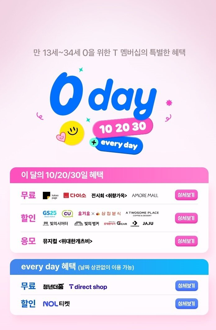 0 Day는 매달 10일, 20일, 30일에 운영되며 다양한 무료 혜택이 제공됩니다. 이번 달에는 카카오페이지 금액권, 다이소 금액권, 디뮤지엄 취향가옥2 전시 초청권, 아모레몰 금액권 등이 포함돼 청년층의 일상에 실질적인 혜택을 더합니다.