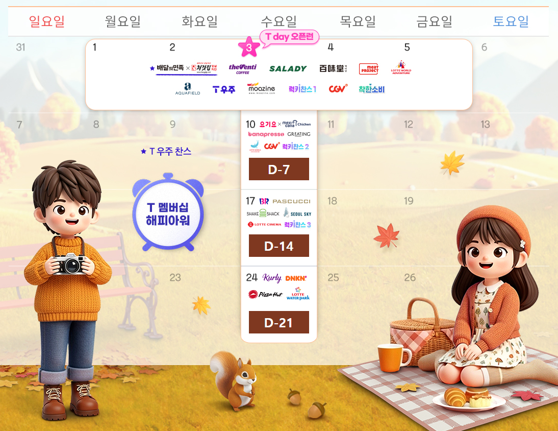 이번 9월 T Day와 해피아워는 누구나 쉽게 활용할 수 있는 브랜드가 중심이 되어 있습니다. 간단한 간식부터 대형테마파크까지 포함되어 있어 실생활에서 체감할 수 있는 만족도가 높습니다.