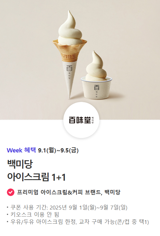 | 백미당 | 아이스크림 1+1 | T 멤버십 앱 쿠폰 | 9/1~9/5 |