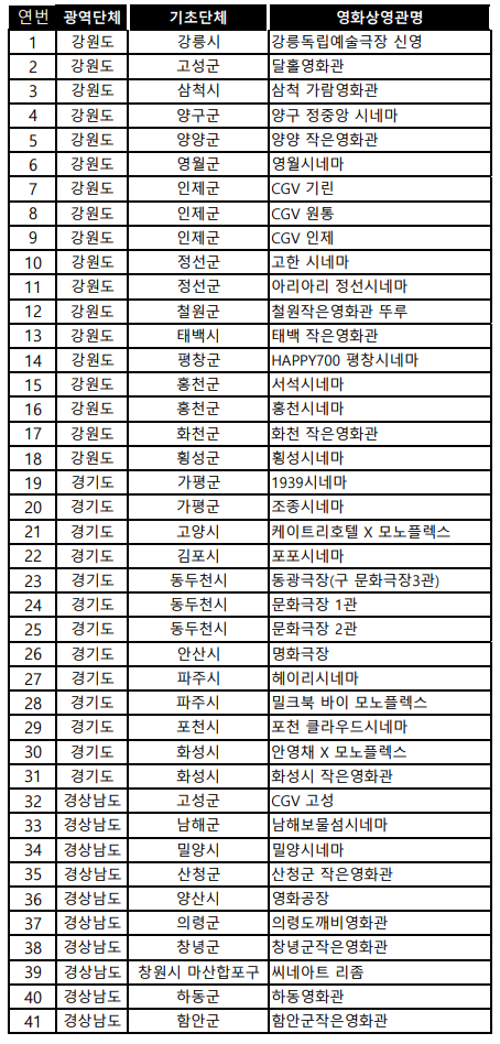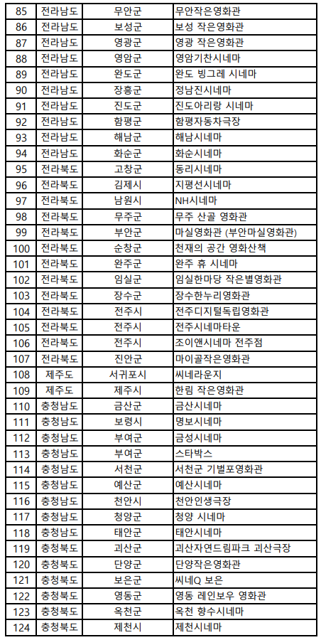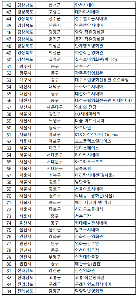 · 기타 참여관: 독립·예술영화전용관, 작은영화관, 실버영화관