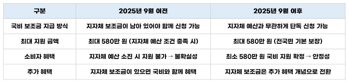 2025년 9월부터 국비 보조금이 기본 지원으로 전환되었지만 지자체 보조금은 여전히 지역별 차이가 존재합니다.