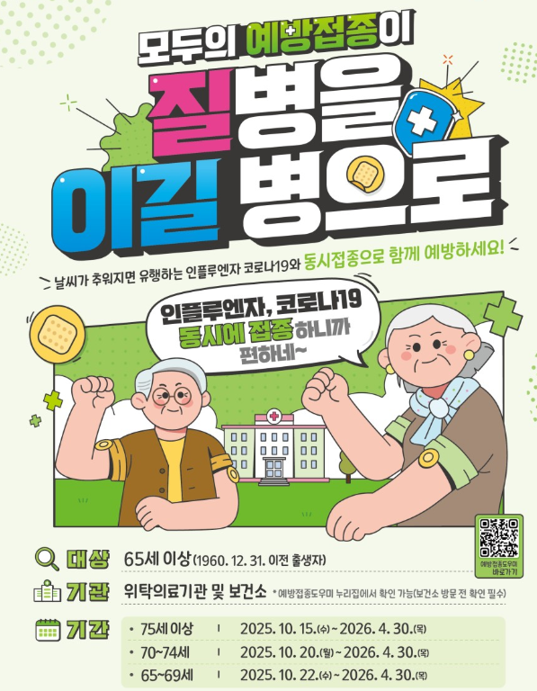 정부는 65세 이상 어르신을 대상으로 코로나19뿐 아니라 인플루엔자 예방접종도 함께 무료 지원하고 있습니다.