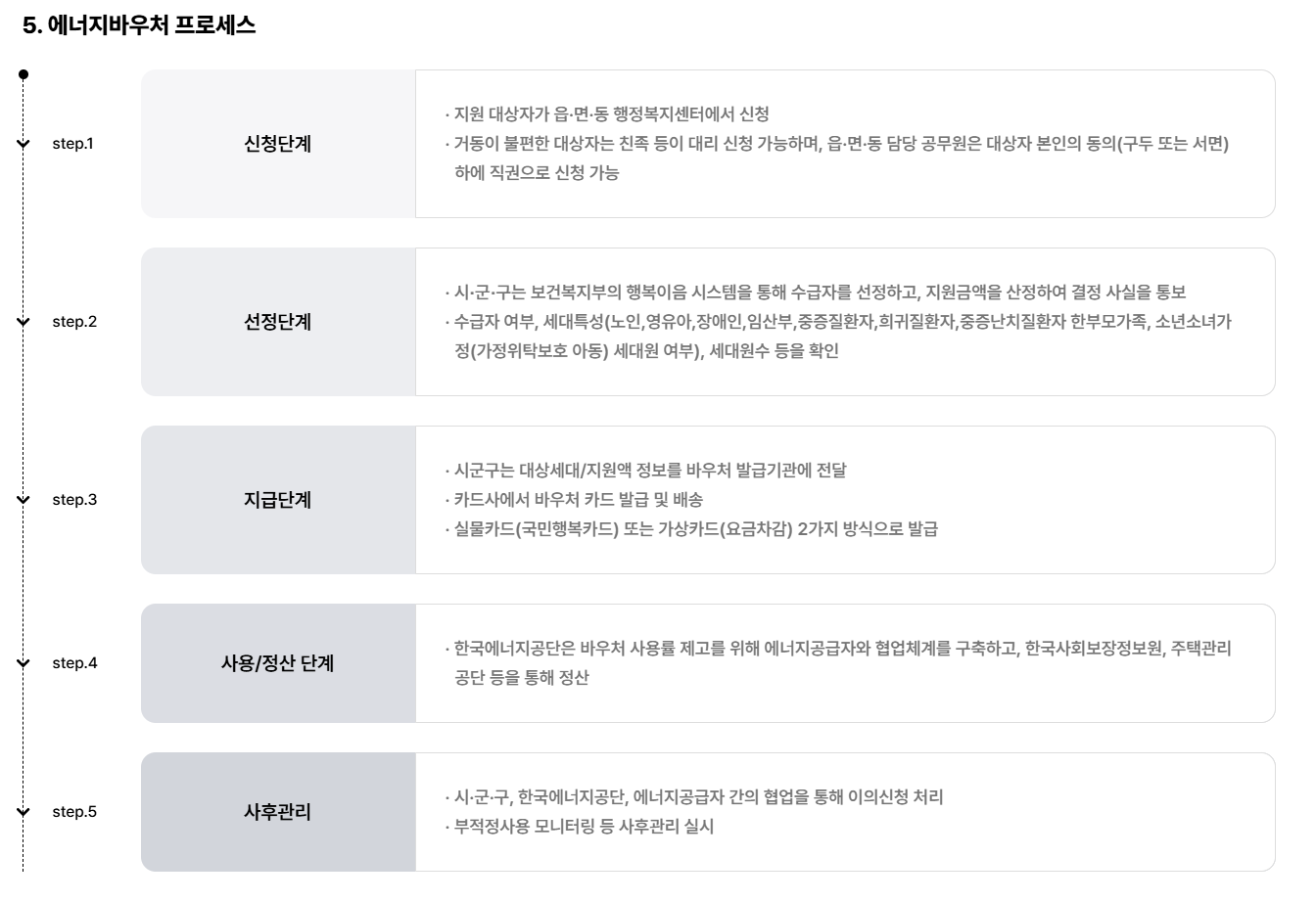 바우처는 전자적 또는 실물카드 형태로 발급되며 사용 시 세대별 고지서에서 요금 차감 또는 카드 결제로 바로 결제 가능합니다.
