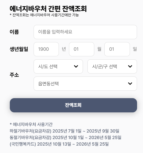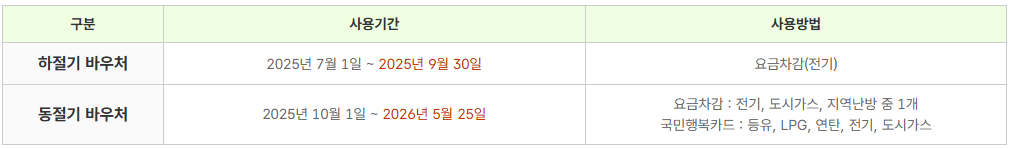 ● 동절기: 10월 1일 ~ 2026년 5월 25일 (전기·도시가스·지역난방 요금 차감 또는 국민행복카드 사용)