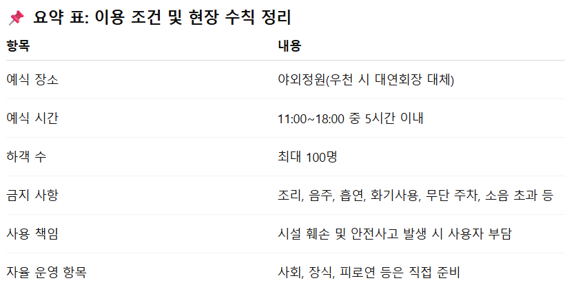 또한 공공시설을 사용하는 만큼 소음과 청결 기준을 반드시 지켜야 하며 장비와 장식물의 무분별한 설치, 음식물 반입 등은 금지되어 있으므로 하객과 진행 요원에게 미리 안내하는 것이 중요합니다.