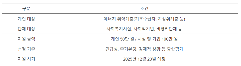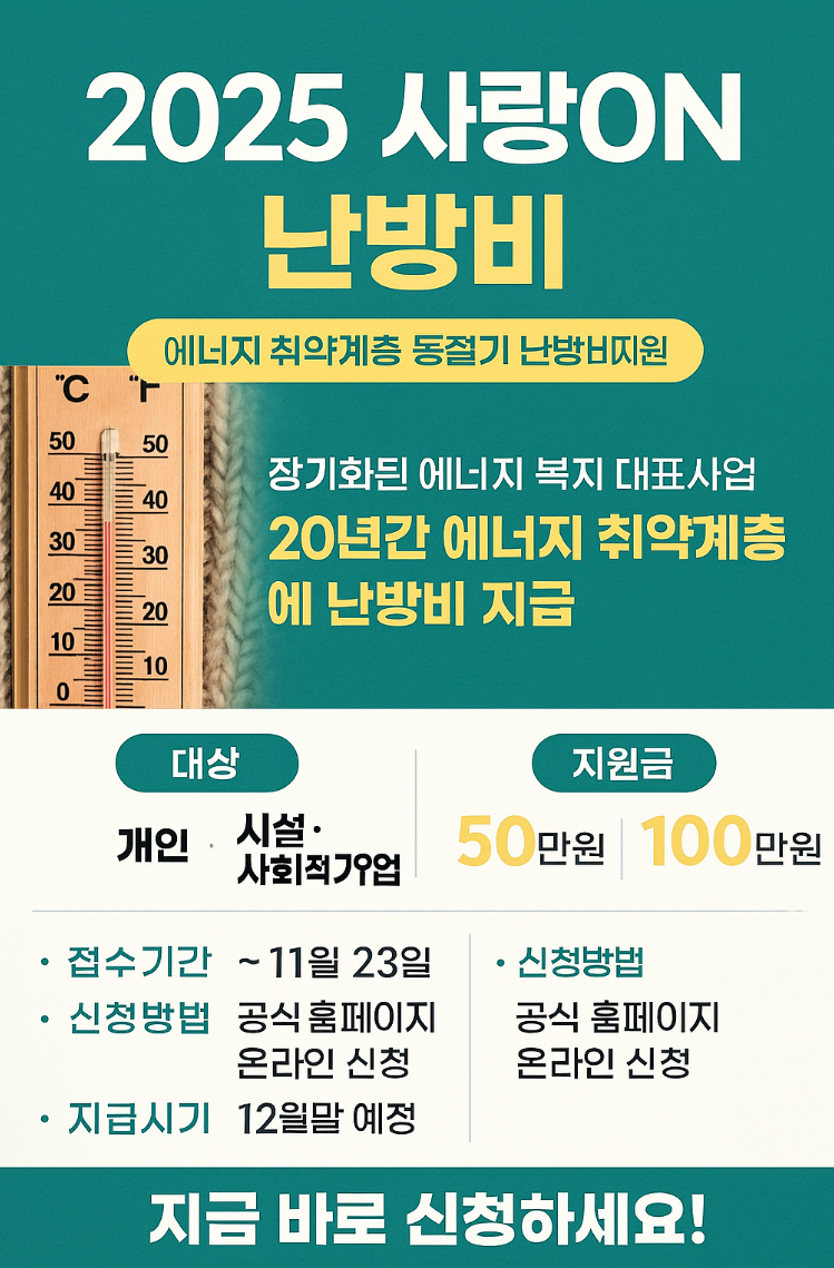 올해도 개인 50만 원 사회복지시설과 사회적기업 각 100만 원의 난방비를 지원하며 신청 기간은 2025년 11월 23일까지입니다.